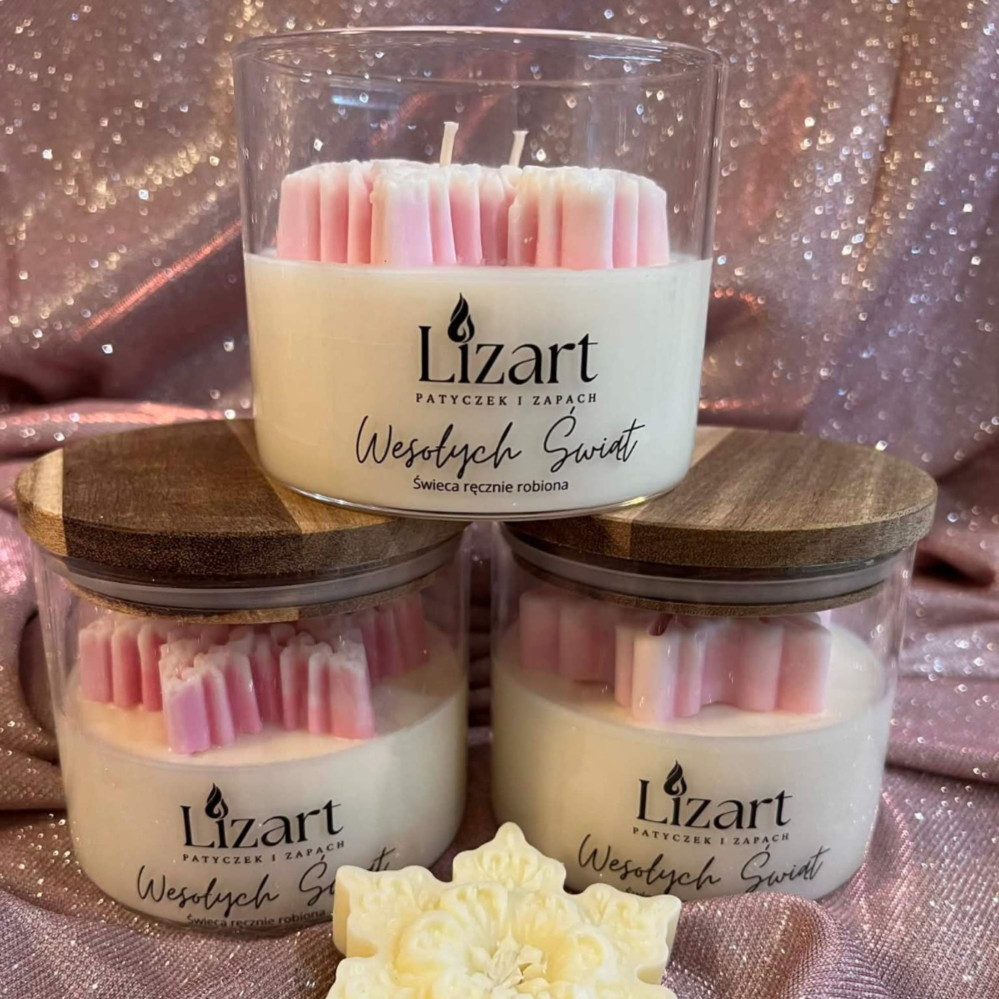 Świeca „Wesołych Świąt” to mała, ręcznie wykonana celebracja zimowej magii. Jej delikatny, kremowy kolor połączony z subtelną różową dekoracją tworzy atmosferę ciepła, bliskości i rodzinnych chwil. To zapach, który przenosi w świat migoczących światełek, cichej muzyki w tle i spokojnych wieczorów spędzanych z najbliższymi.