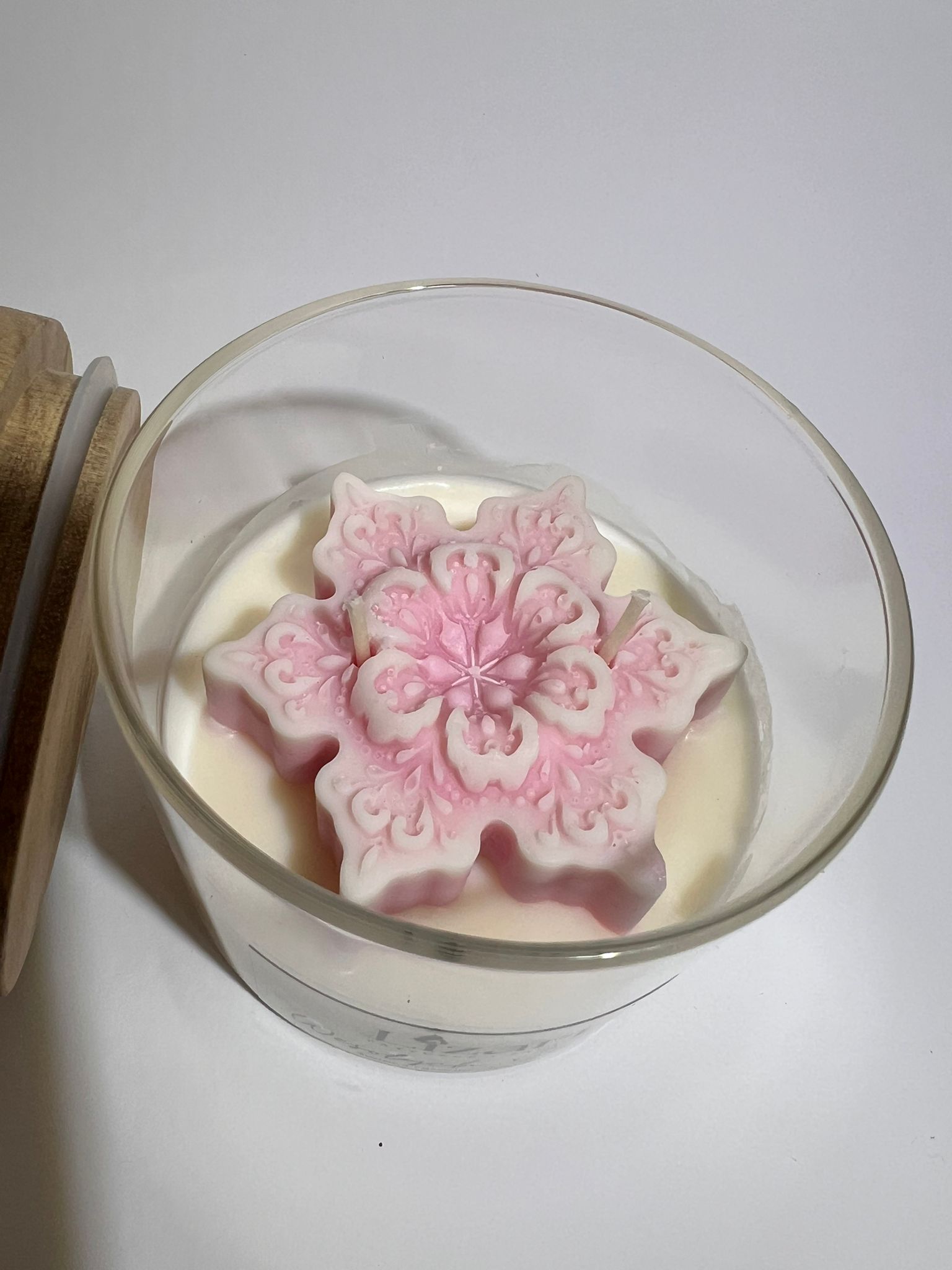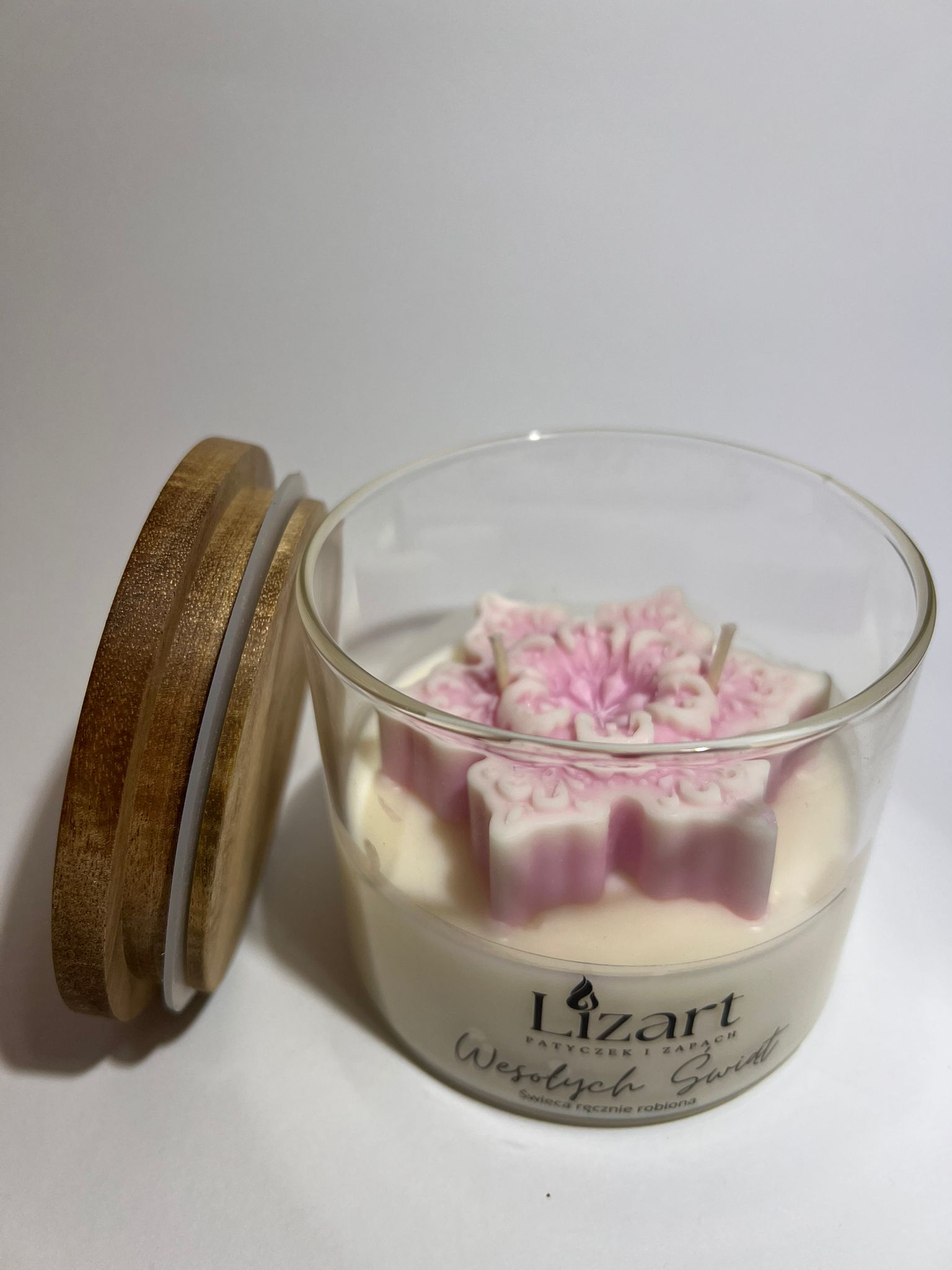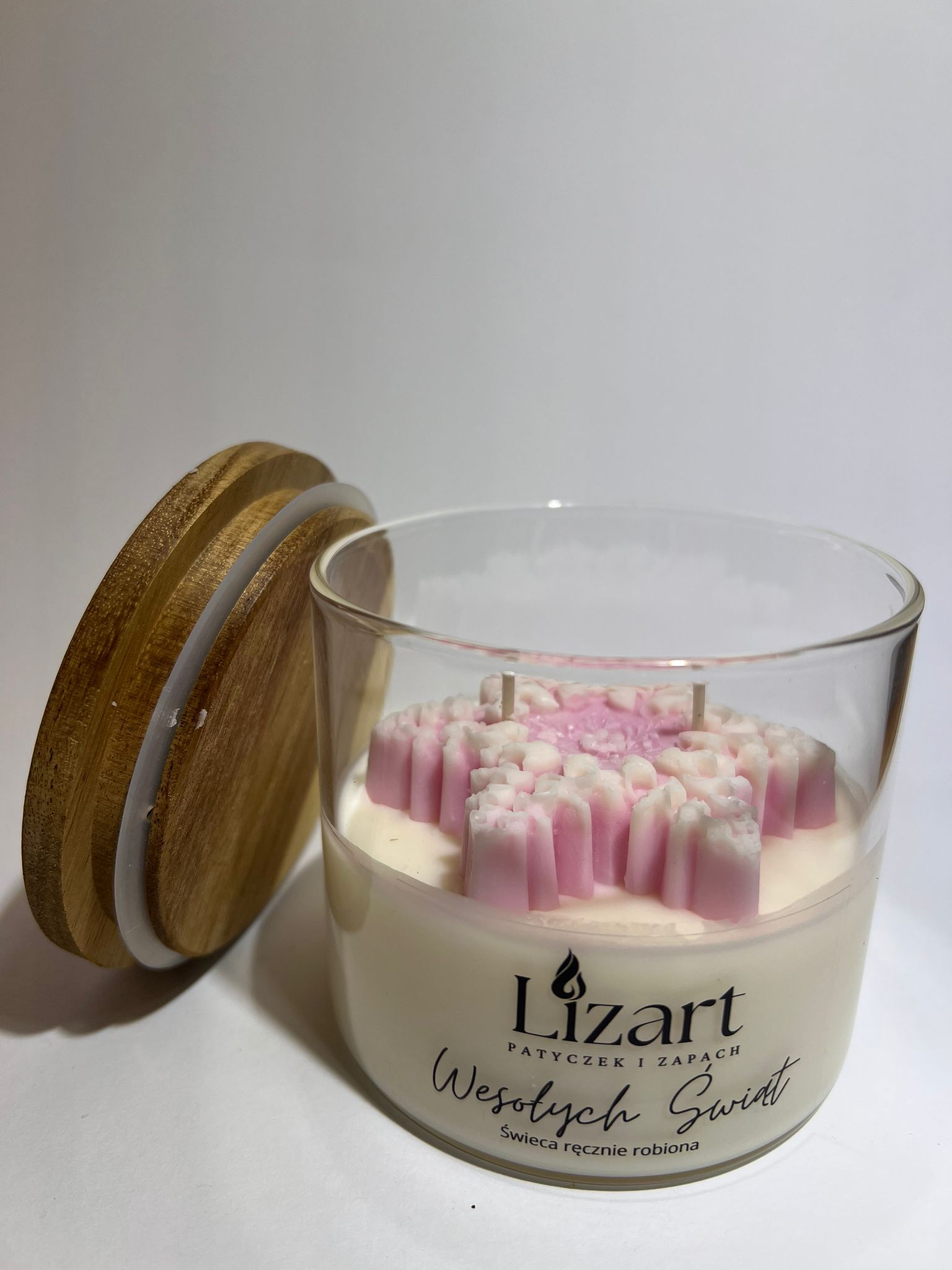 Każdy element został wykonany z troską – od kremowej bazy po misternie uformowany różowy środek, który wygląda jak maleńki świąteczny deser. Świeca roztacza w domu miękki, słodki aromat, który koi zmysły i otula wnętrze zimową słodyczą.
